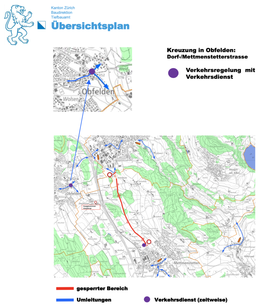 Auch wenn der Verkehr grossräumig umgeleitet wird, führt dies wohl zu Verkehrsbehinderungen beim Lichtsignal Kreuzstrasse in Obfelden. Aus diesem Grund ist an der Kreuzung Dorf-/Mettmenstetterstrasse ein Verkehrsdienst vorgesehen. Es lohnt sich wohl zu Stosszeiten in der Woche vom 19. bis 25. April etwas mehr Zeit vorzusehen.