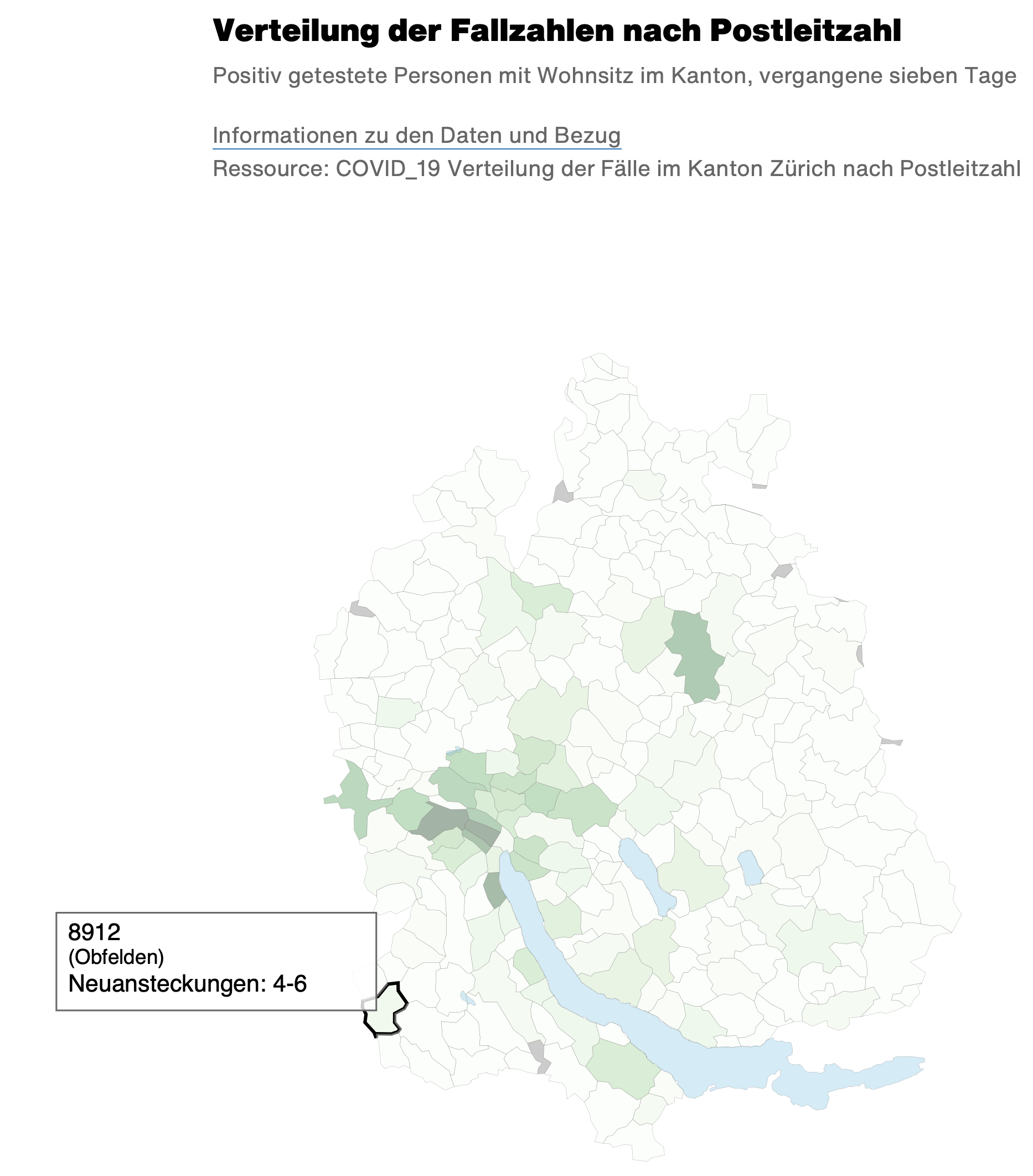 In Obfelden gab es in den letzten 7 Tagen gemäss Angaben des Kantons Zürich 4 – 6 Neuansteckungen. Im Bezirk Affoltern kam es in der Woche 41 zu 20 neuen Fällen. Das sind 3.6 Fälle pro 100’000 Einwohnern, was einer der tiefsten Werte im Kanton Zürich aktuell ist.