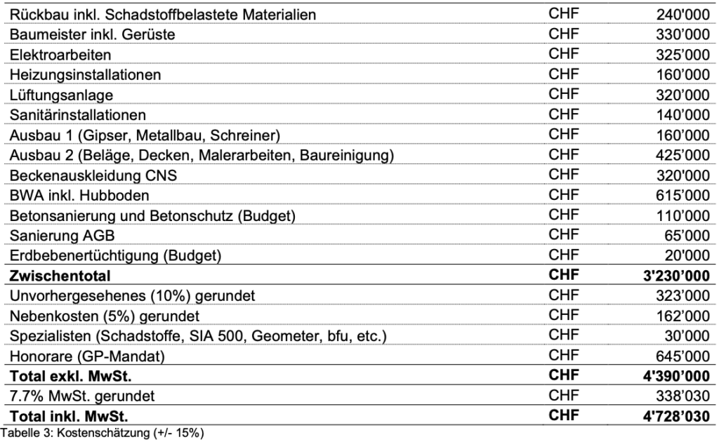 Die Gesamtkosten werden mit Fr. 4’728’030.- beziffert. Grösster Posten mit Fr. 615’000.- ist die Badewasseraufbereitung inkl. Hubboden. Jeweils um die Fr. 300’000.- entfallen auf die elektrischen Installationen, Lüftungsanlagen und die Beckenauskleidung. Die weiteren Budget-Positionen sind nachfolgend zu finden: