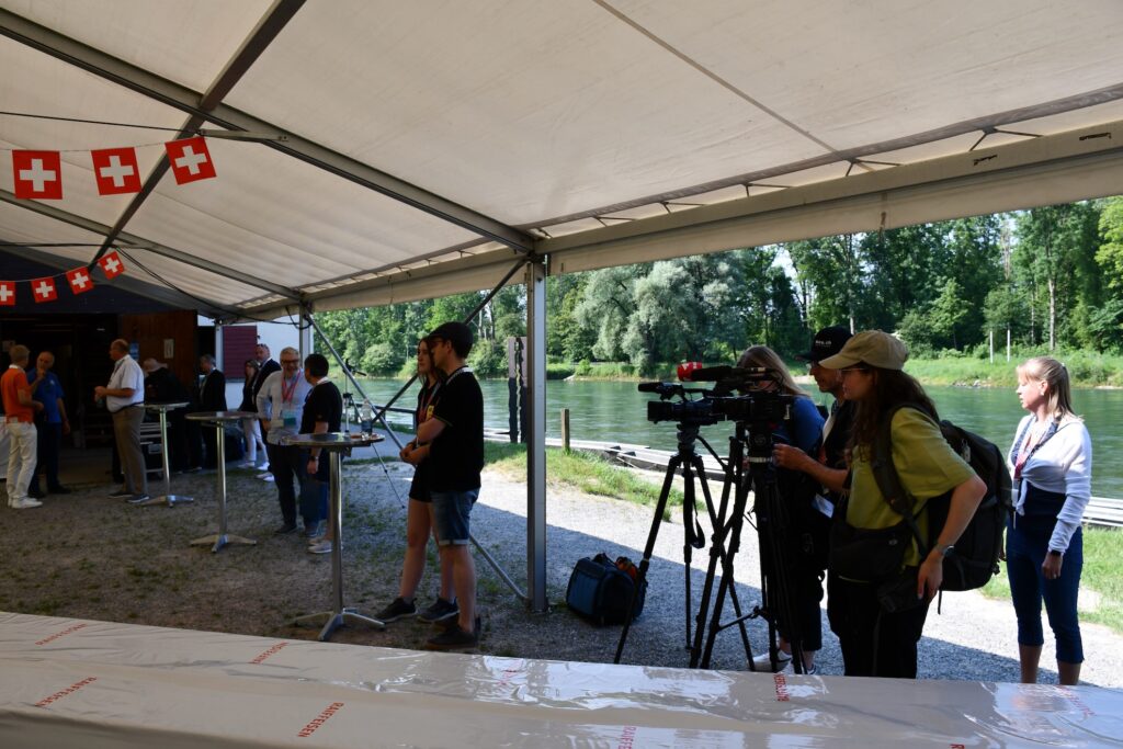 Am Samstag um 10.01 Uhr war es soweit. Gemeinsam schnitten die Gemeindepräsidenten von Obfelden und Ottenbach flankiert von ASTRA-Direktor Jürg Röthlisberger (links) und Regierungsrat Martin Neukom (rechts) das Band vor dem Portal der Überdeckung durch. Dem offiziellen Akt folgten weitere Reden im Pontonier-Zelt in Ottenbach.