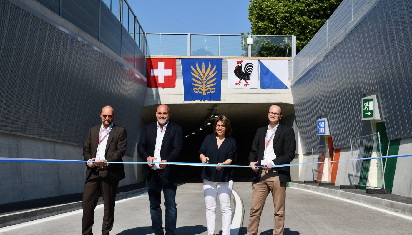 Am Samstag um 10.01 Uhr war es soweit. Gemeinsam schnitten die Gemeindepräsidenten von Obfelden und Ottenbach flankiert von ASTRA-Direktor Jürg Röthlisberger (links) und Regierungsrat Martin Neukom (rechts) das Band vor dem Portal der Überdeckung durch. Dem offiziellen Akt folgten weitere Reden im Pontonier-Zelt in Ottenbach.