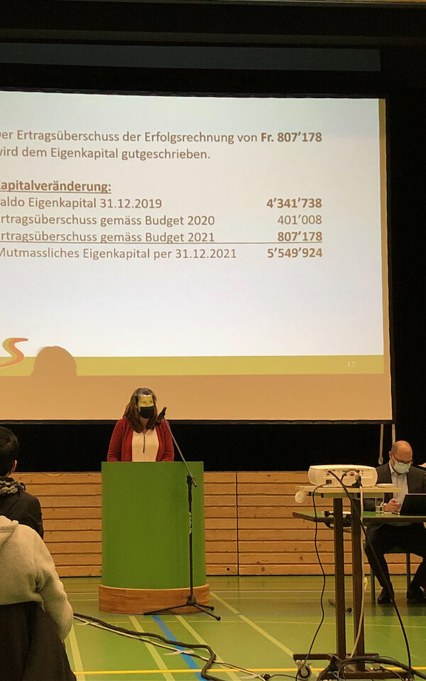 Das zweite Traktandum sorgte kurz für Unruhe. Das von Finanzvorsteherin Bettina Bucher vorgeschlagene Budget 2021 und der unveränderte Steuerfuss von 26% sorgte für einen Antrag. Frau Caruso verlangte eine Senkung auf 24%, da die Erhöhung nur für den Neubau des Schulgebäudes benötigt wurde und jetzt wieder rückgängig gemacht werden sollte. Sie habe das detailliert durchgerechnet. Dem Anliegen wurde entgegnet, dass in den nächsten Jahren Kredite über 5 und 3 Millionen Franken zurückbezahlt werden müssen und somit für genügend Geld gesorgt werden muss.