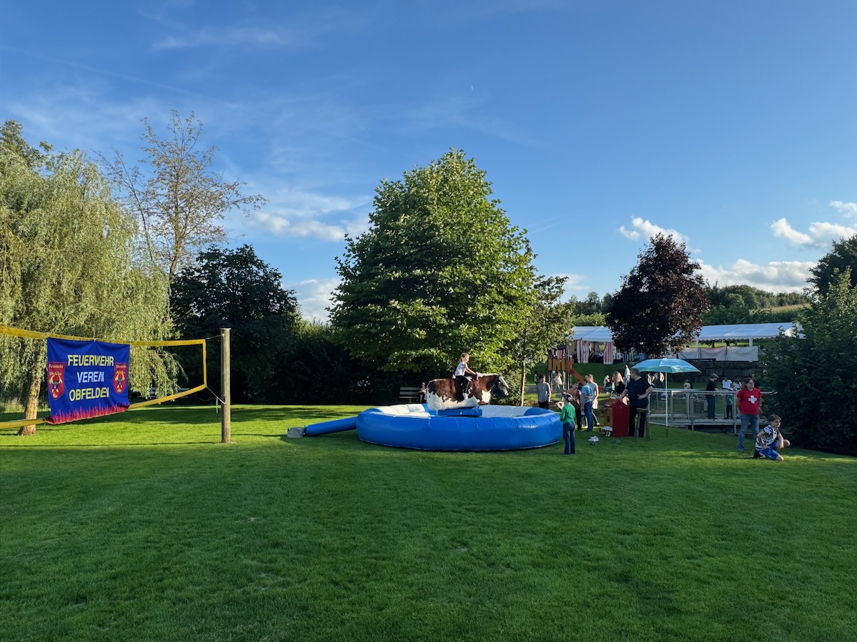 Die Helfenden des Feuerwehrvereins versorgten die Gäste wie immer mit Würsten, Plätzli und Pommes. Dazu kam das Dessertbuffet und Kaffees mit Güx. Die Badi-Beiz ergänzte mit Getränken und alkoholischen Drinks. Auch das eine oder andere Glacé wurde geschleckt. Für die Kinder waren Bull-Riding, Schminken oder auch ein Seifenblasen-Workshop organisiert – aber auch sonst wusste der Nachwuchs sich auf der Spielwiese zu betätigen.