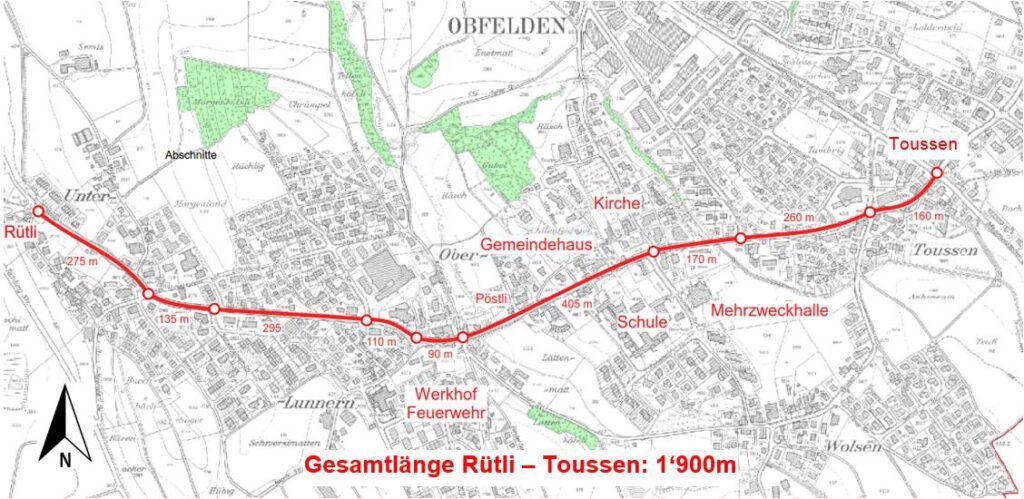 Die Studie umfasst die Dorfstrasse ab dem Rütli bis nach Toussen zum ehemaligen Hirschen. Gemäss dem Plan sind dies genau 1.9 Kilometer. Diese Strecke wird in Zukunft vom Kanton auch abklassiert zur Gemeindestrasse.