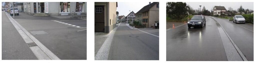Diese Massnahmen führen zu einer Fahrbahnbreite von 6 Metern. Dazu kommt ein Velostreifen dorfaufwärts. So können sich Autos und Velos ohne Einschränkungen kreuzen. Wenn sich Bus oder LKW kreuzen, muss auf den Radstreifen ausgewichen werden.