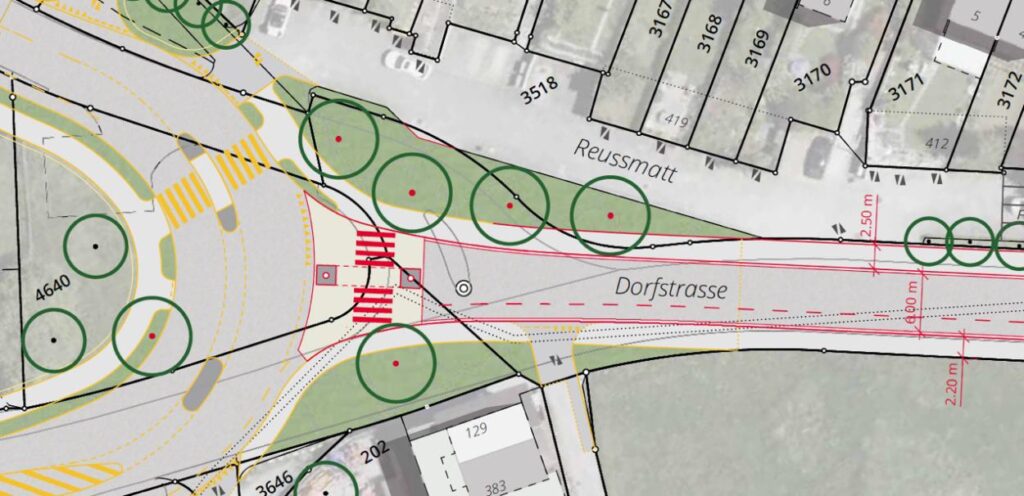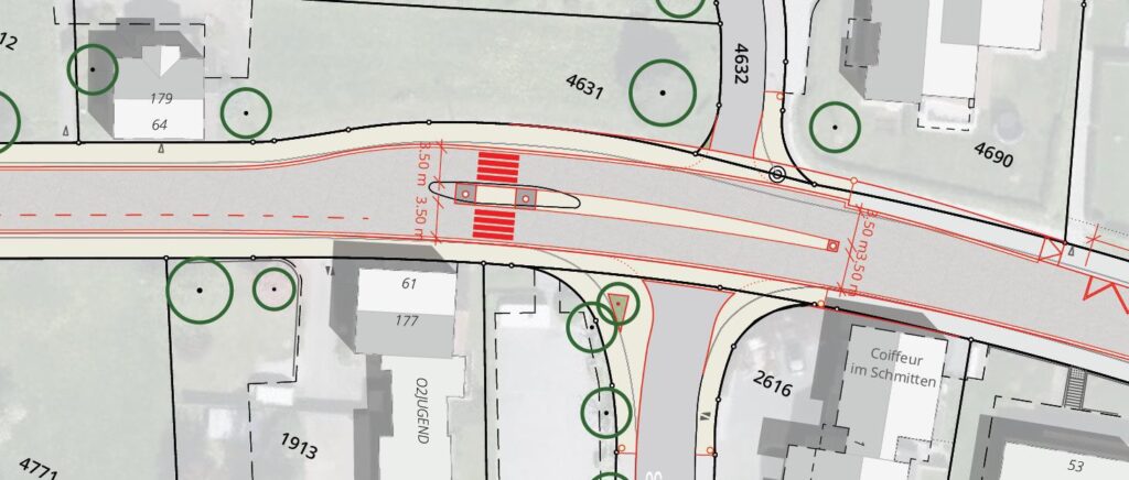 Eine Einengung mit Mittelinsel ist im Bereich Schmittenstrasse geplant. Dort soll nach der Fussgängerüberquerung der Dorfstrasse ein geschützter Bereich für die velofahrenden Schülerinnen und Schüler geschaffen werden.