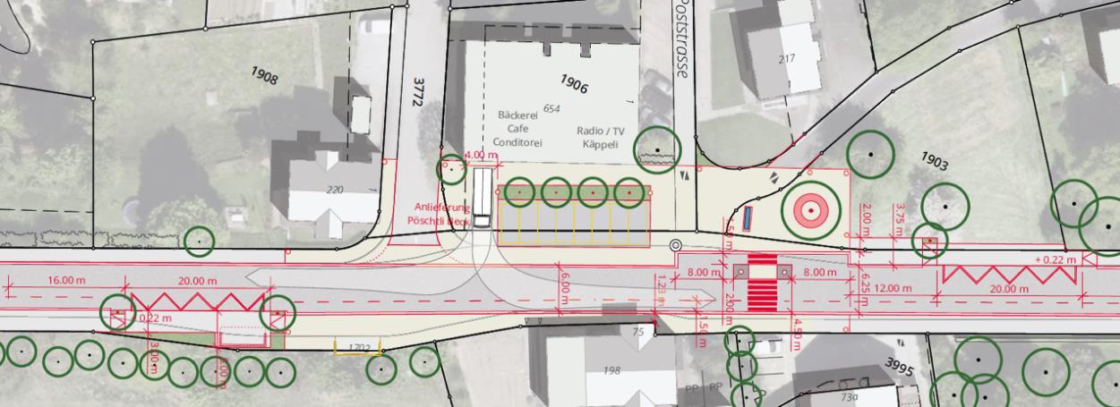 Eine Einengung mit Mittelinsel ist im Bereich Schmittenstrasse geplant. Dort soll nach der Fussgängerüberquerung der Dorfstrasse ein geschützter Bereich für die velofahrenden Schülerinnen und Schüler geschaffen werden.