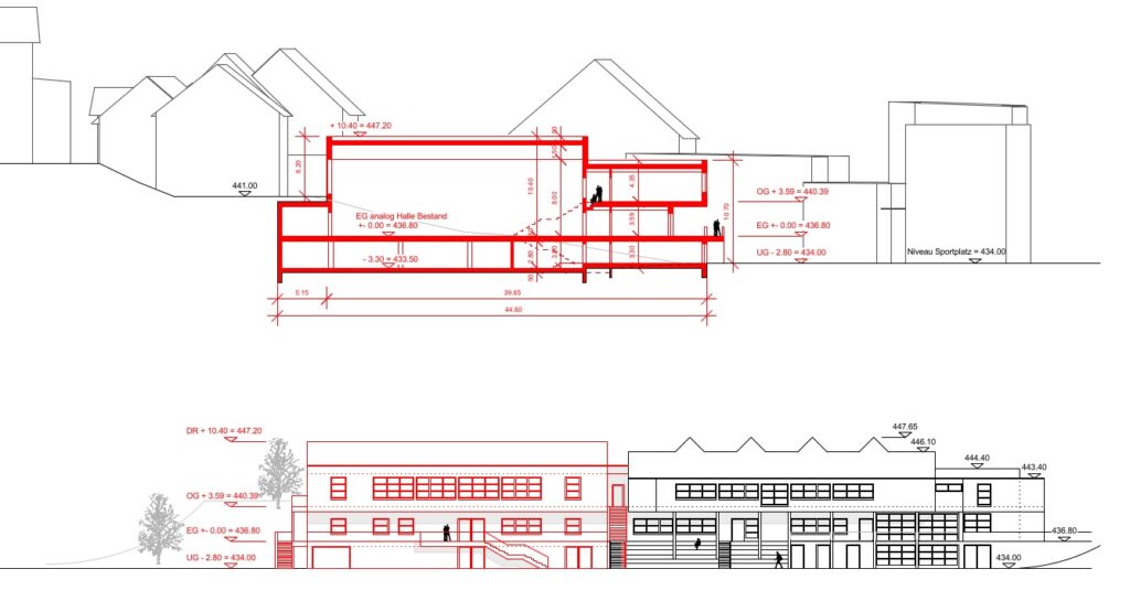 Die bestehende Doppelturnhalle soll in Richtung der Wohnblöcke an der Schmittenstrasse erweitert werden. Eine Machbarkeitsstudie zeigte verschiedene Varianten auf. Die Gemeinde plant nun die Erweiterung um zwei Hallen. Favorisiert wird dabei ein Ausbau zur Dreifachturnhalle und eine abgetrennte vierte Halle.