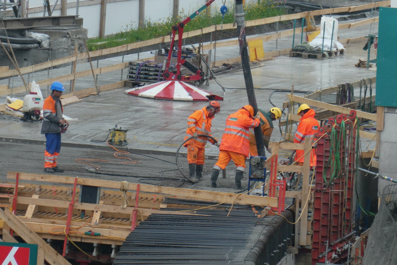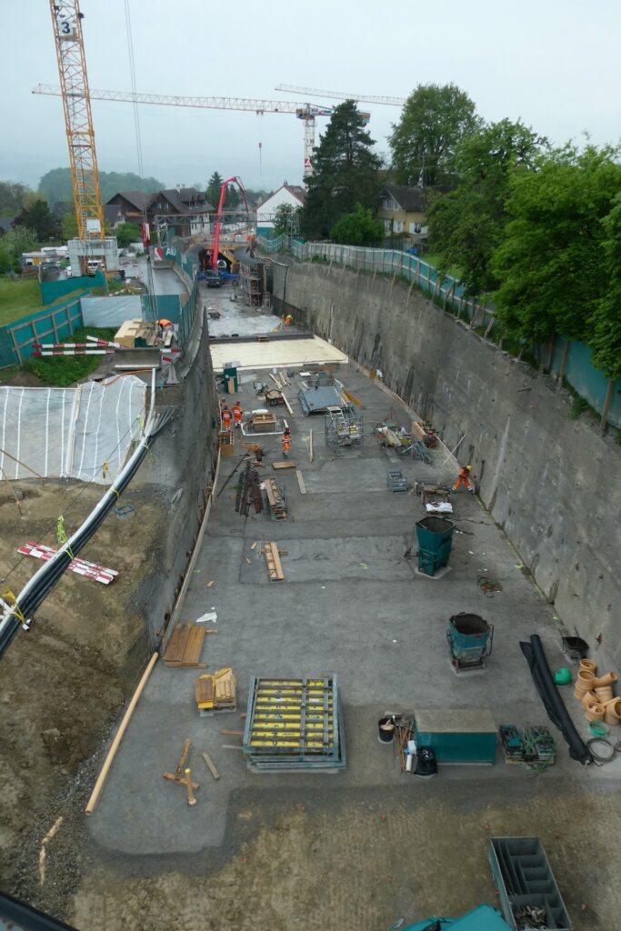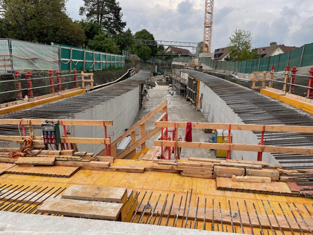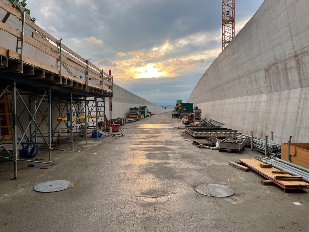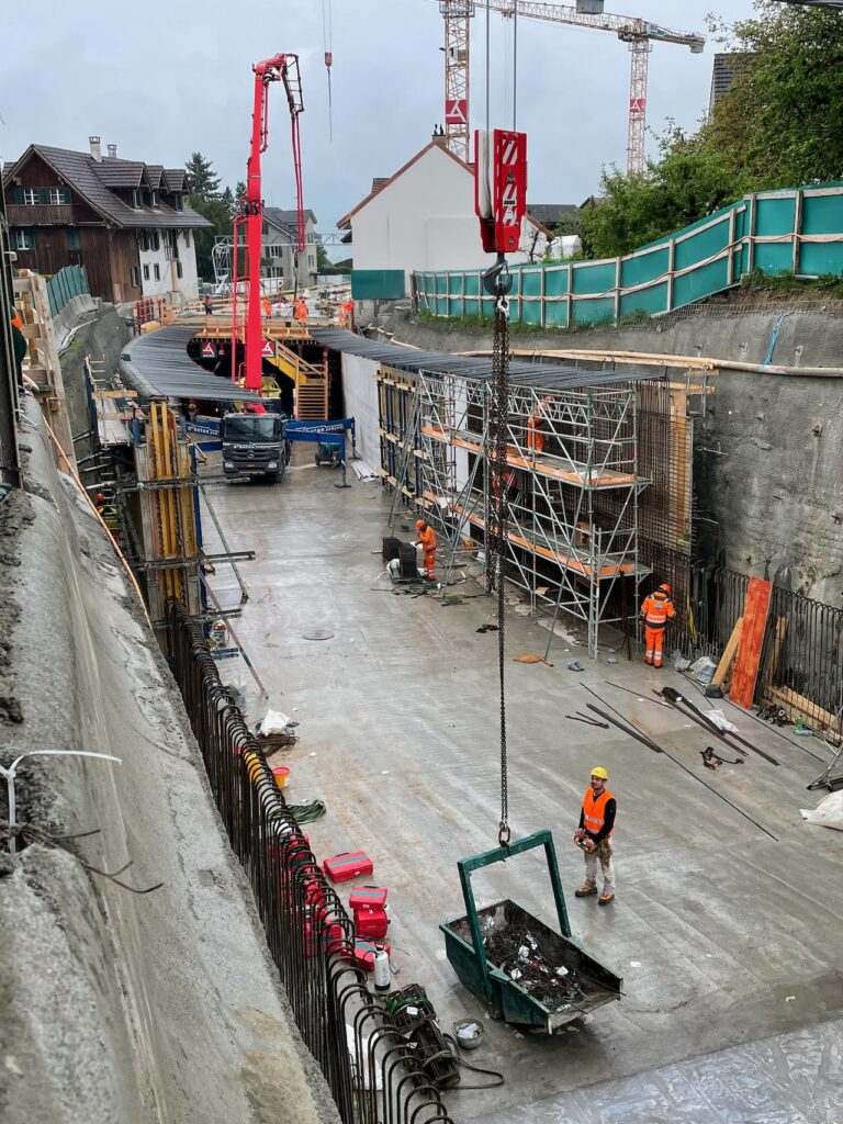 Von der Arbeitsweise her läuft hier alles im Wochentakt. Anfangs Woche wird eine Bodenplatte vorbereitet und betoniert, danach folgen die Wände und Ende Woche eine Decke. Danach kann diese über das Wochenende trocknen und in der neuen Woche wird eine patentierte Konstruktion mit den Schalwänden vorwärts bewegt. So entstehen jede Woche 12.5 Meter der Überdeckung.