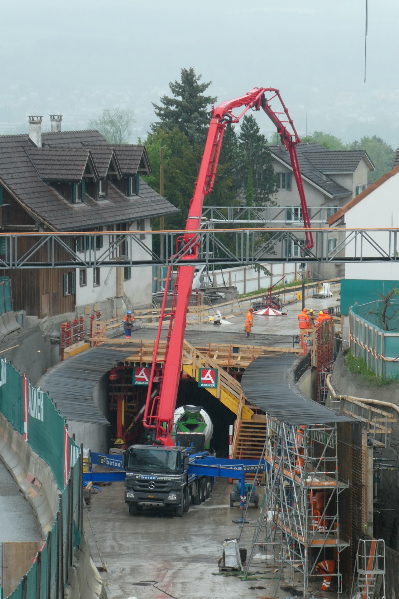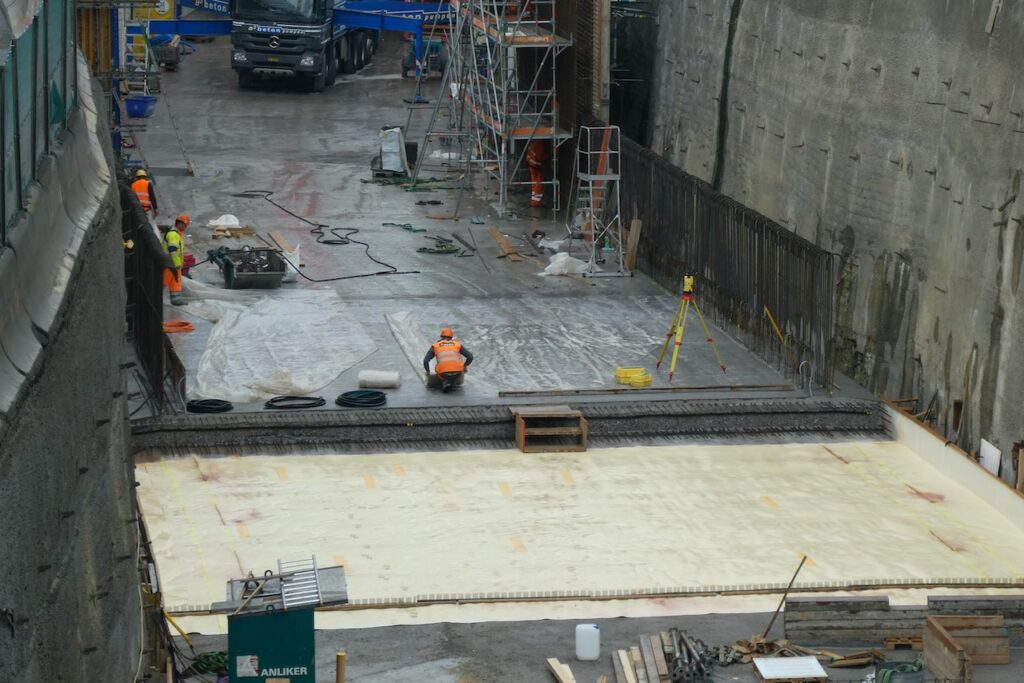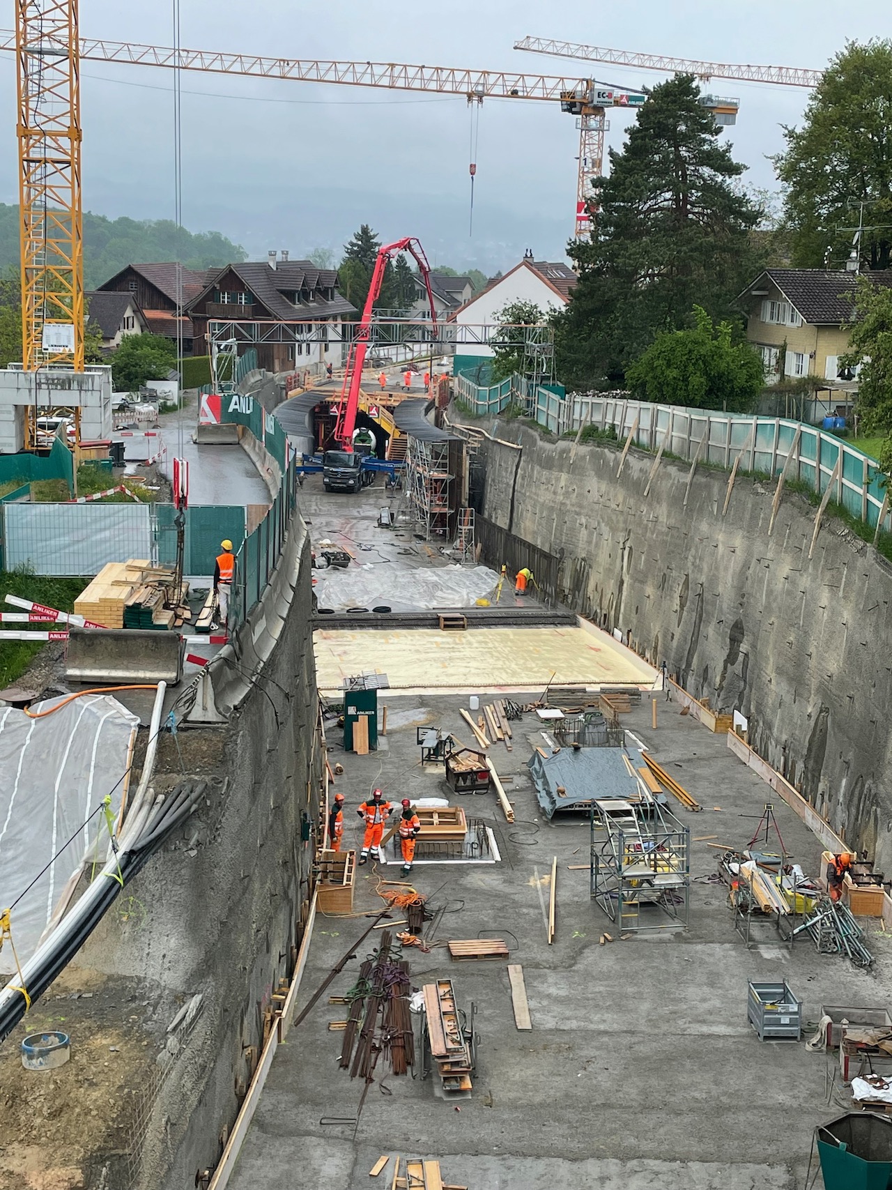 Von der Arbeitsweise her läuft hier alles im Wochentakt. Anfangs Woche wird eine Bodenplatte vorbereitet und betoniert, danach folgen die Wände und Ende Woche eine Decke. Danach kann diese über das Wochenende trocknen und in der neuen Woche wird eine patentierte Konstruktion mit den Schalwänden vorwärts bewegt. So entstehen jede Woche 12.5 Meter der Überdeckung.