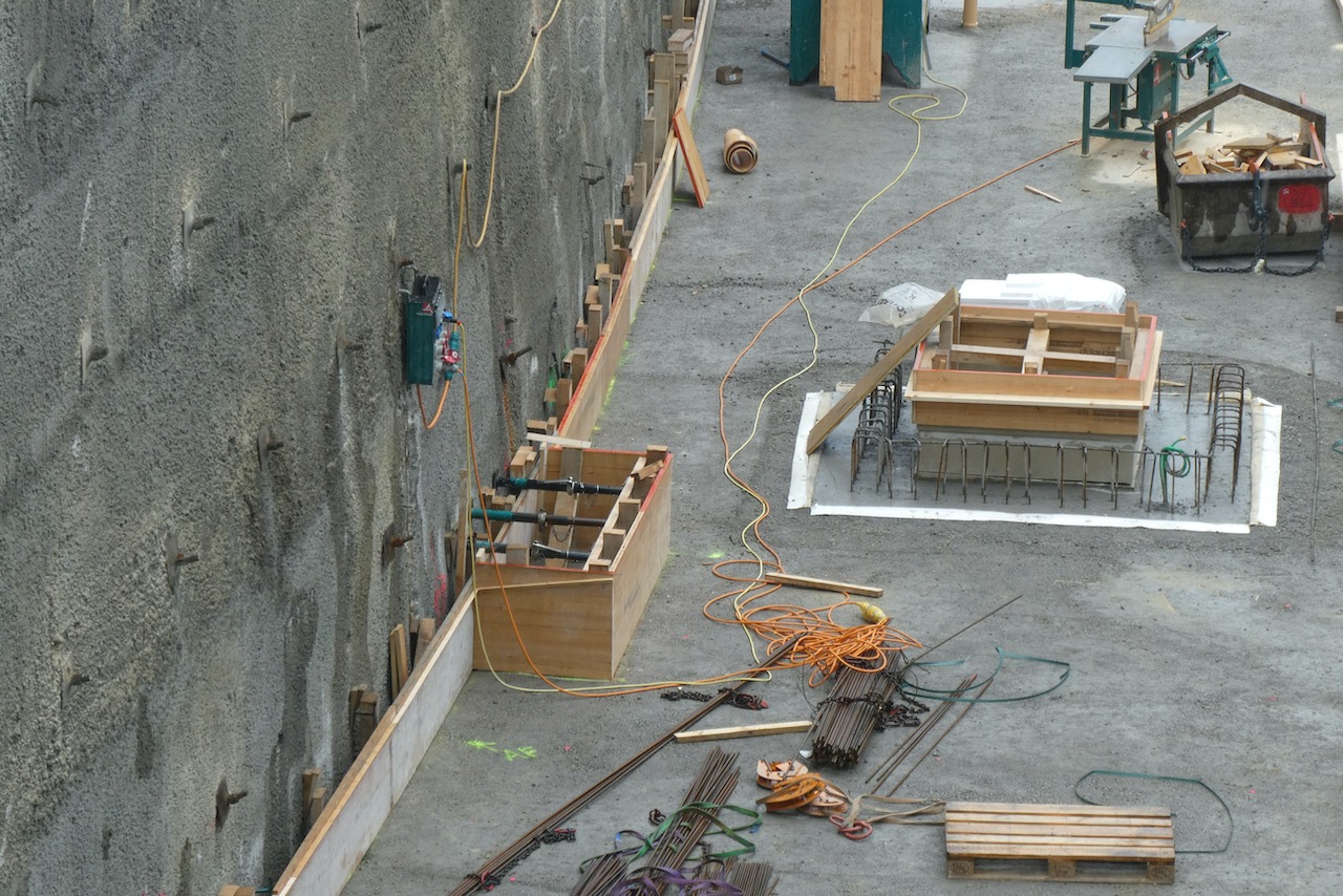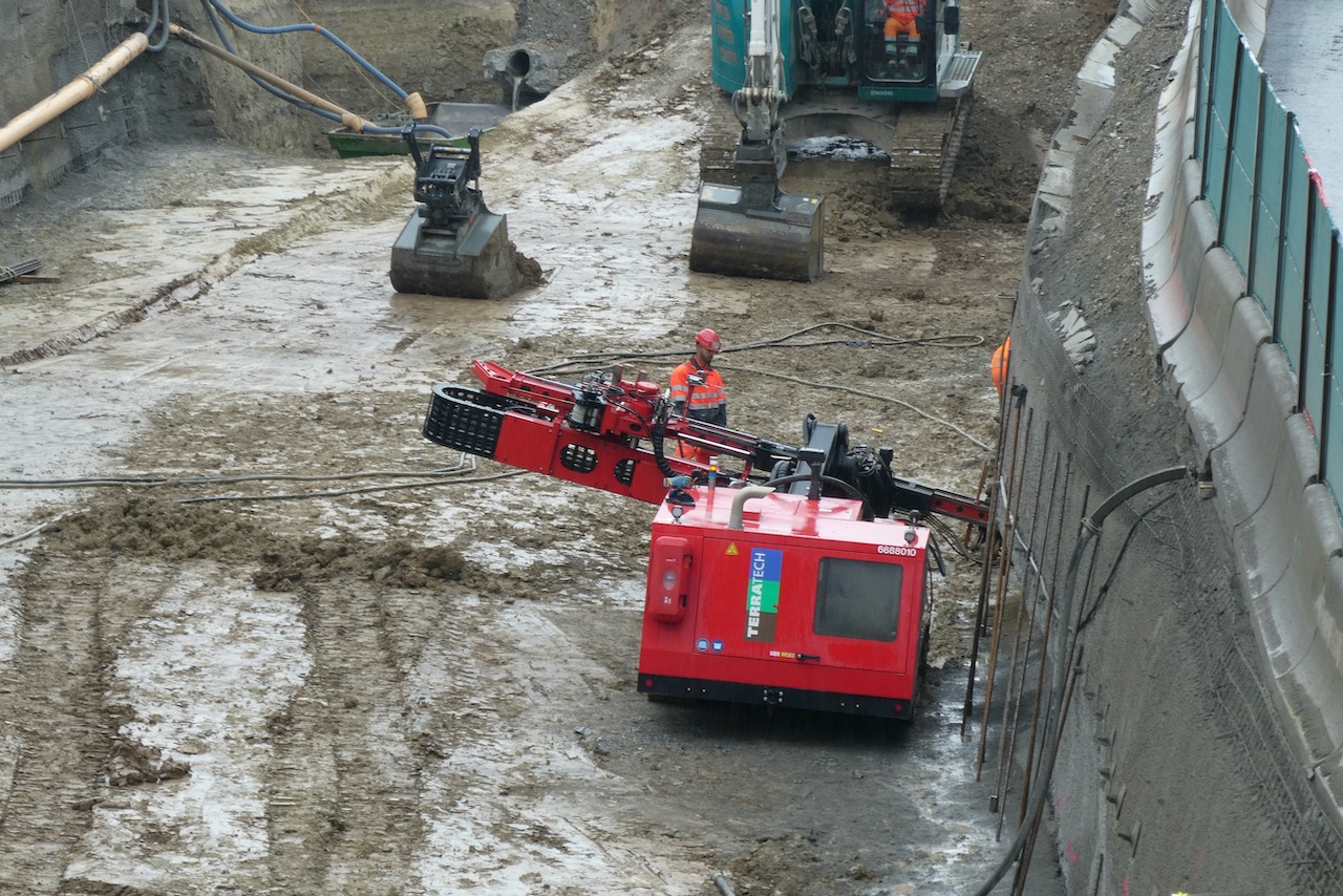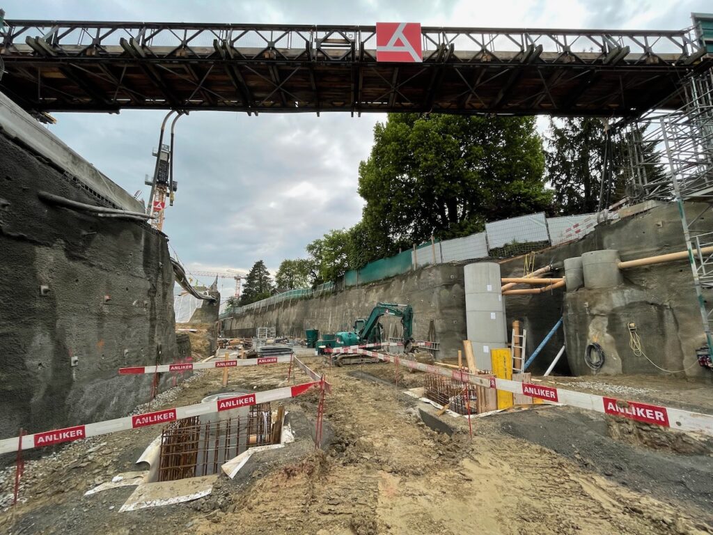 Die Baustelle wird auch komplett überwacht. Jeden Woche vermessen Geologen verschiedene Punkte, um allfällige Verschiebungen zu bemerken. Diese halten sich aber in engen Grenzen. Dabei hilft auch die Absicherung der Grube mit Spritzbeton und sogenannten Nagelwänden. Dafür werden bis zu 8 Meter lange Metallstangen in die Seitenwände gebohrt, um diese abzusichern.