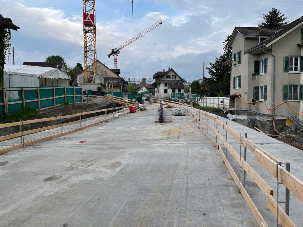 Vom neuen Kreisel an der Affolternstrasse in Ottenbach führt der Weg in Zukunft durch die neue Überdeckung zum Autobahnanschluss bei der Kreuzung Hirschen. Die Überdeckung Bickwil wird von den Verantwortlichen immer wieder als das Herzstück der Baustelle bezeichnet. Im April 2021 starteten die Vorarbeiten. Leitungen wurden umgelegt, Bauplätze errichtet und die Passerelle für Fussgänger und Velofahrer errichtet. Diese liegt übrigens genau auf dem oberen Ende der Überdeckung.