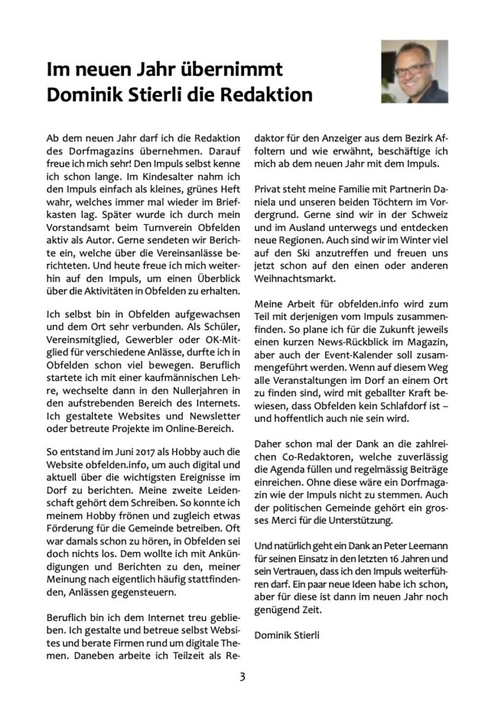 Seit über 50 Jahren erscheint in Obfelden das Dorfmagazin Impuls. In den letzten 16 Jahren fungierte Peter Leemann mit seiner Werbeagentur als Redaktor für das im A5-Format erscheinende Heft. Mit dem Beginn des neuen Jahres übernimmt Dominik Stierli mit seiner Firma stierli digital solutions GmbH die Aufgabe. Das Obfelder Unternehmen betreibt auch die News-Website obfelden.info.