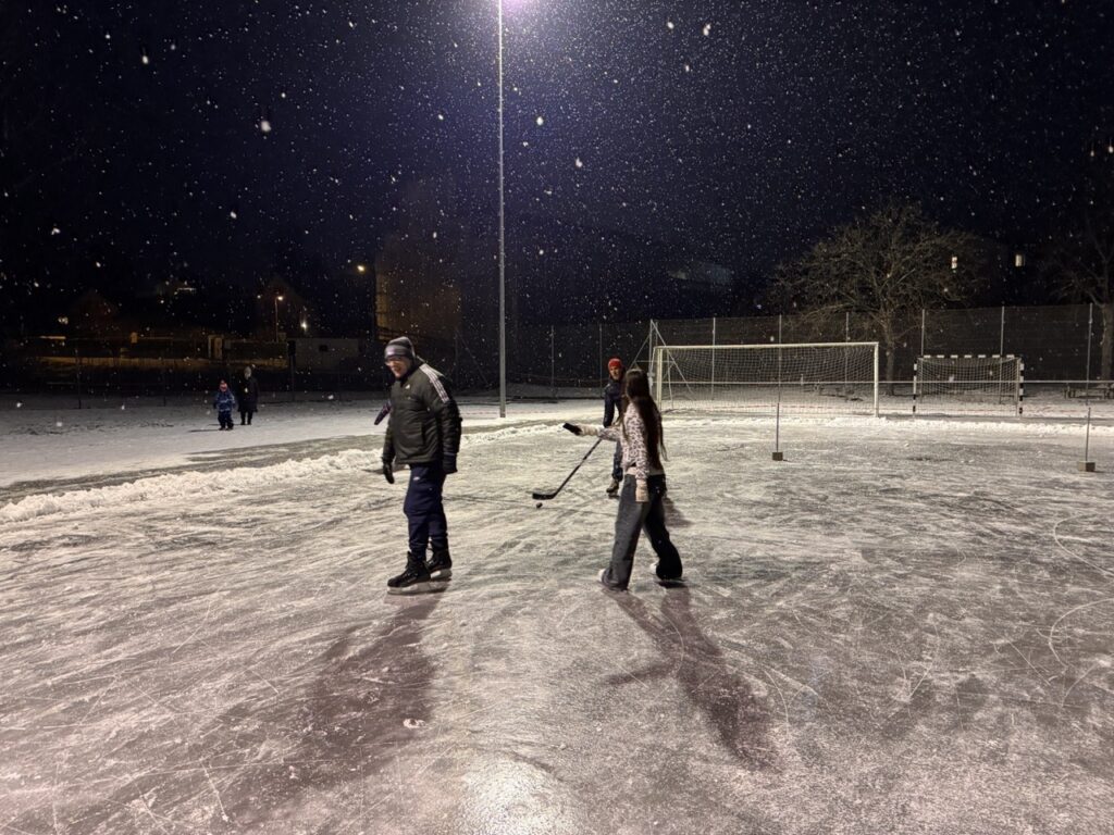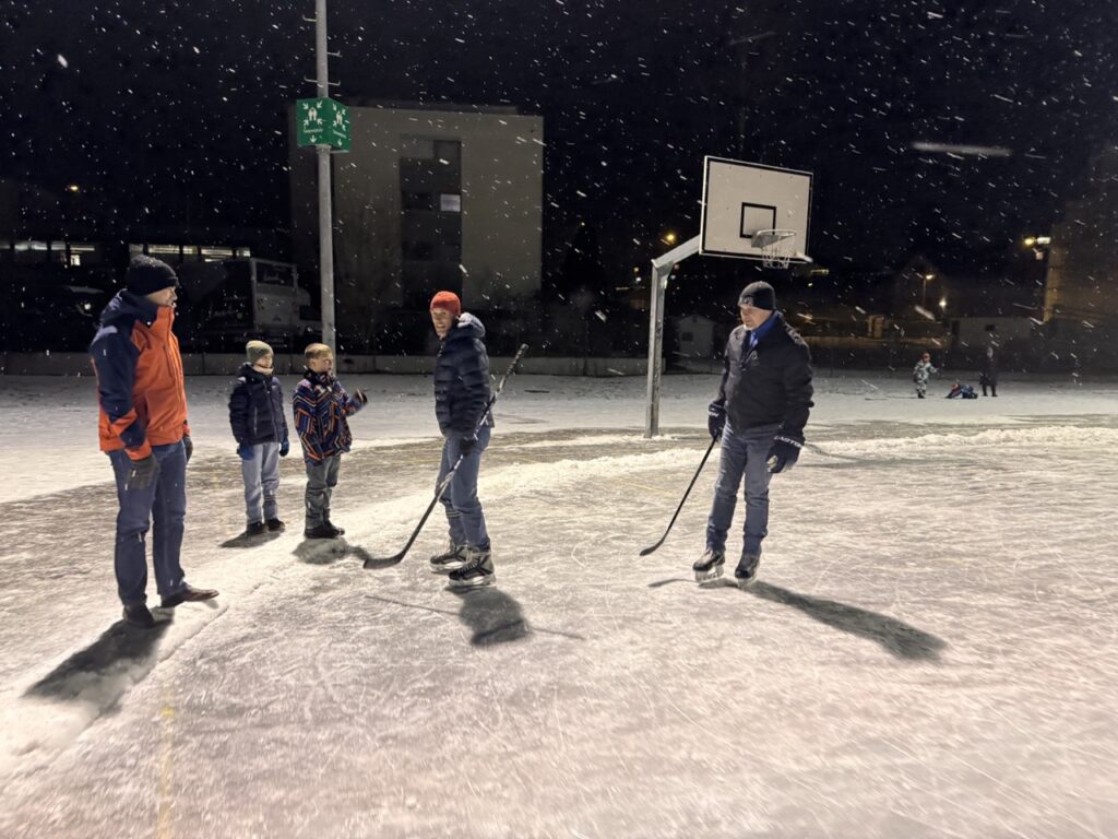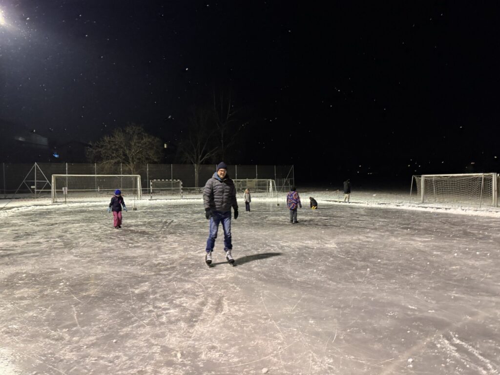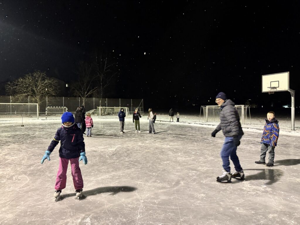 Am ersten Abend waren ein paar Kinder, meistens ohne Schlittschuhe, aber auch gut fünf Personen mit Kufen an den Füssen auf dem Eisfeld unterwegs. Dieses war natürlich nicht perfekt, doch ermöglichte es ein einmaliges Erlebnis und sogar mit Stock und Eishockey-Puck nutzten zwei Männer die glatte Oberfläche. Dazu kam die perfekte Winterstimmung mit leichtem Schneefall.