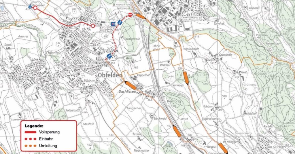 Für den abschliessenden Einbau des Deckbelags auf der Dorf- und Muristrasse im Bereich der Kreuzung Hirschen in Obfelden wird der Verkehr vom 11. bis 17. April einspurig geführt. Wer von Affoltern nach Obfelden gelangen will, wird über Mettmenstetten umgeleitet. Die Strecke von Obfelden in Richtung Affoltern bleibt offen.