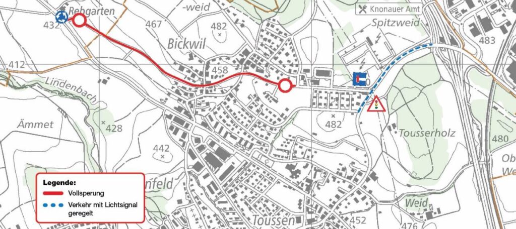 Der öffentliche Verkehr kann wie gewohnt die Strecke befahren. Einzig die Haltestelle «Hölibachstrasse» in Fahrtrichtung Affoltern wird gut 150 Meter in Richtung Obfelden versetzt. In einer zweiten Etappe von Montag, 17. April bis Freitag, 28. April regelt ein Lichtsignal den Verkehr. In diesem Zeitraum wird auch der reguläre Veloweg gesperrt und über den Spazierweg auf der anderen Seite umgeleitet.