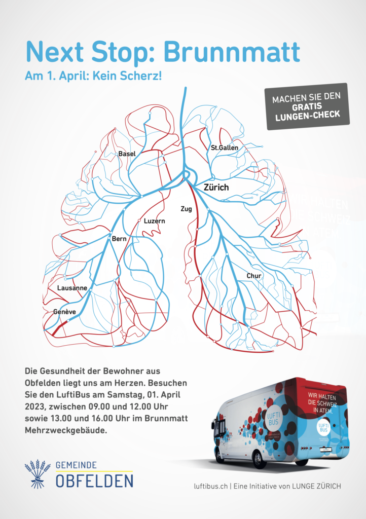Die Gesundheit der Bewohner aus Obfelden liegt uns am Herzen. Besuchen Sie den LuftiBus am Samstag, 01. April 2023, zwischen 09.00 und 12.00 Uhr sowie 13.00 und 16.00 Uhr im Brunnmatt Mehrzweckgebäude.