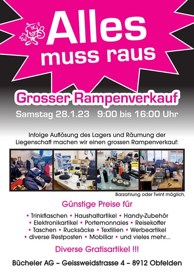Grosser Rampenverkauf infolge Lagerräumung und Umzug * am nächsten Samstag 28.1.2023 * 09:00 bis 16:00 * Geissweidstrasse 4 in Obfelden * günstige Preise * Wühlkisten mit Gratisartikel *Barzahlung oder Twint möglich