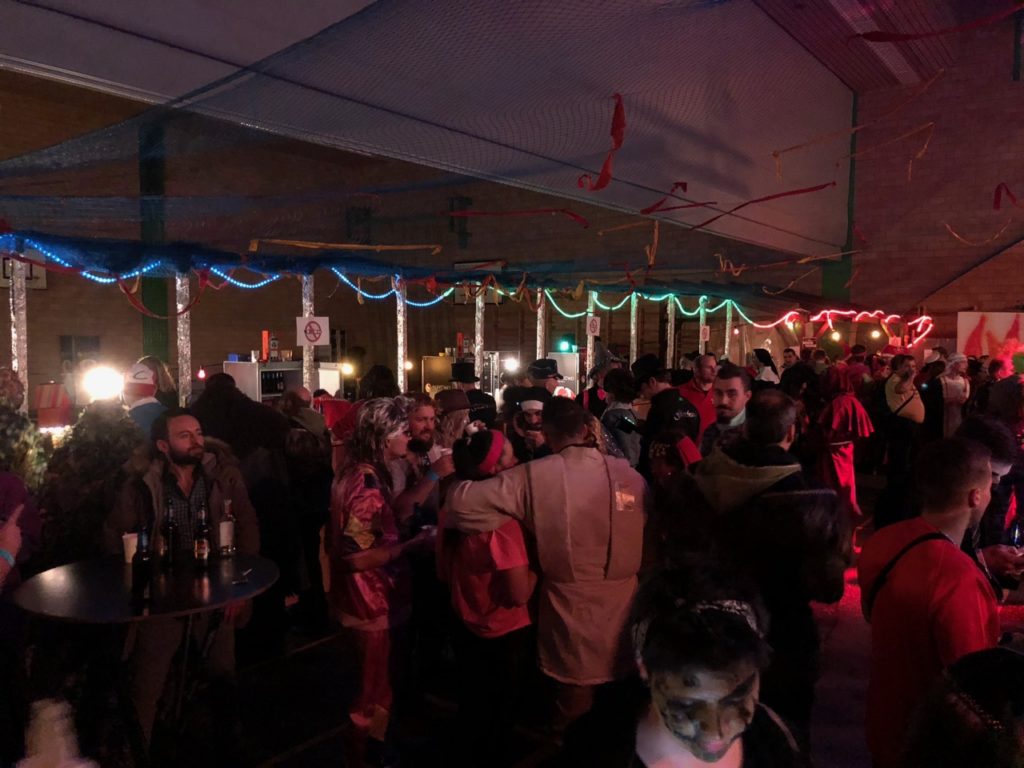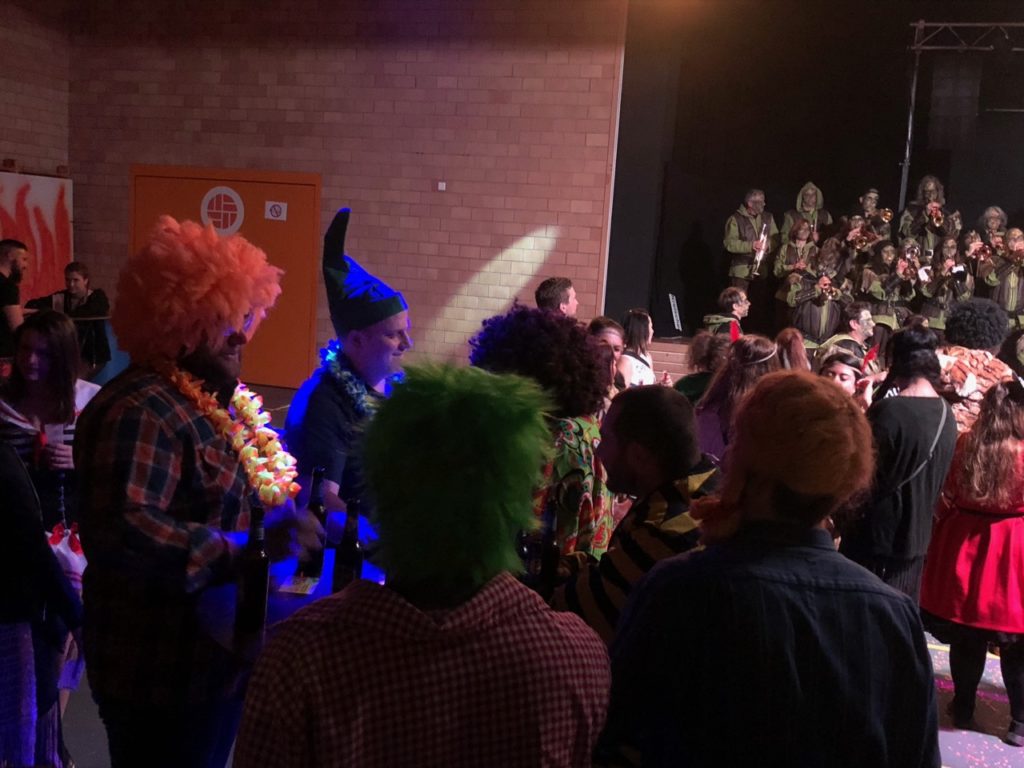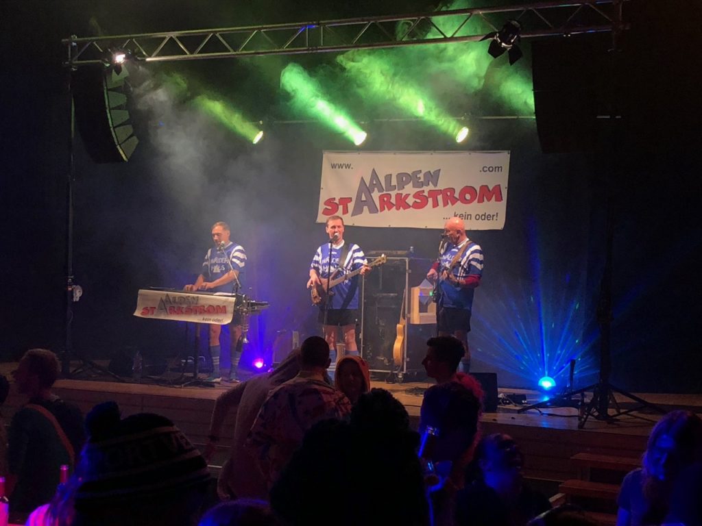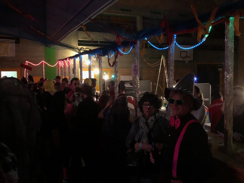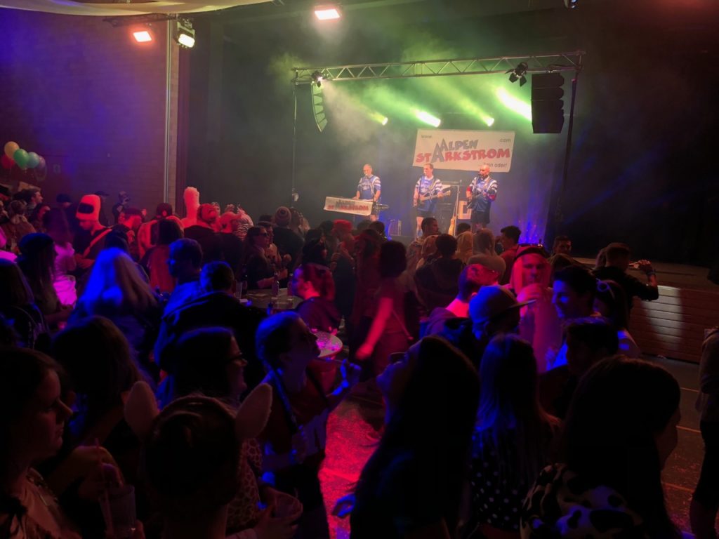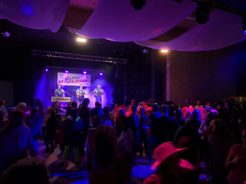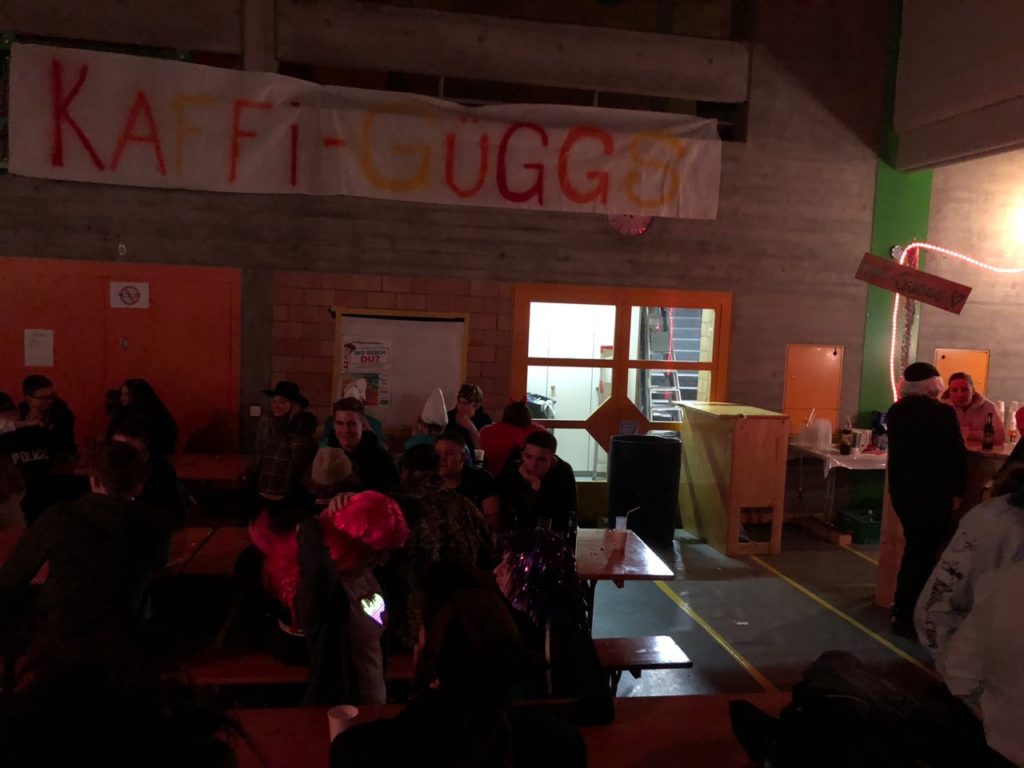 Die Fasnächtler empfing im Eingangsbereich eine kleine Bar, Garderobe und ein Verpflegungsstand und in einem Teil der grossen Mehrzweckhalle eine grosse, lange Bar. Im Stundentakt waren die Guggenmusiken von Affoltern am Albis, Hedingen und Widen zu hören. Dazwischen spielte die Band Alpenstarkstrom einen Hit nach dem anderen.