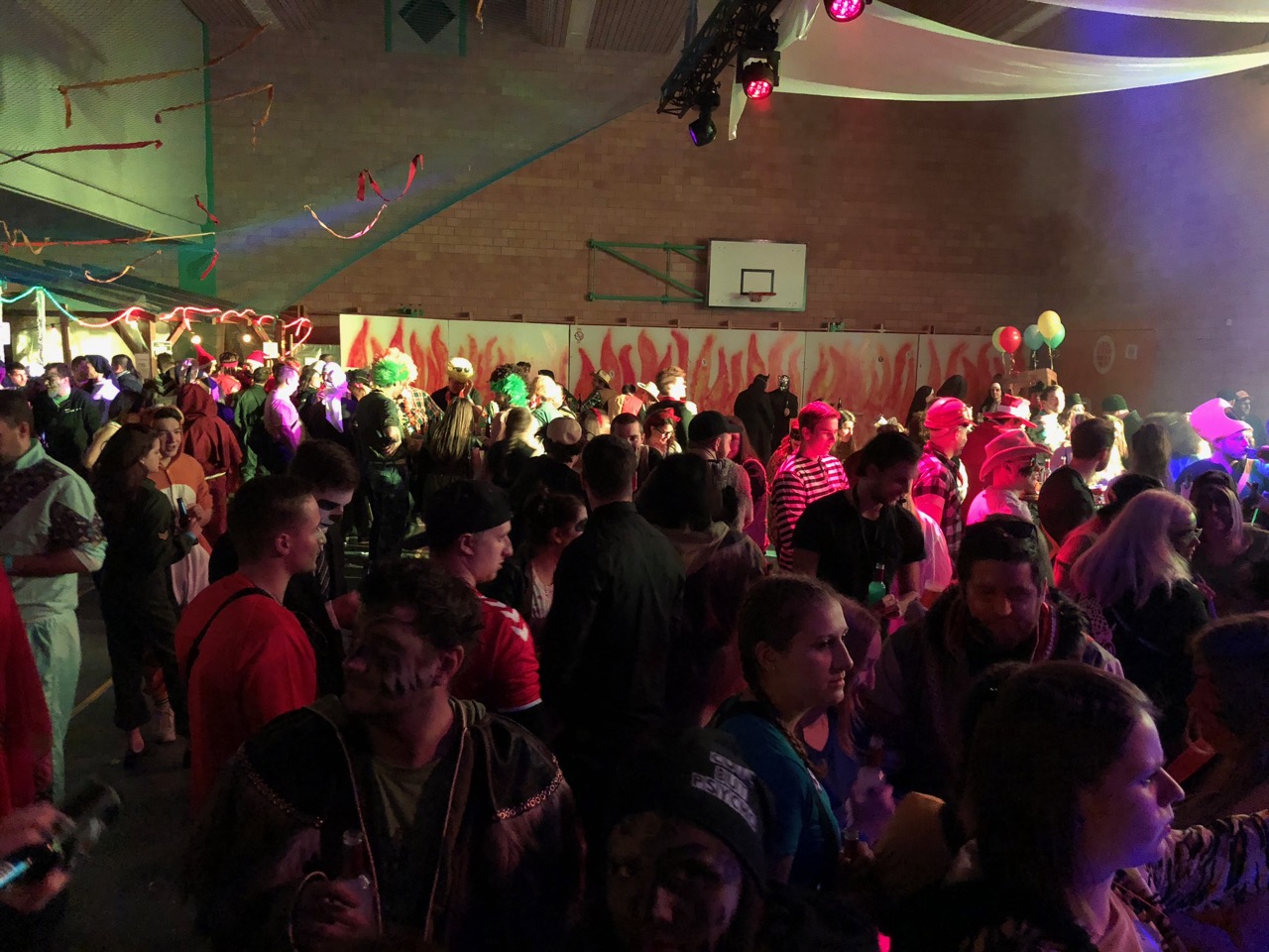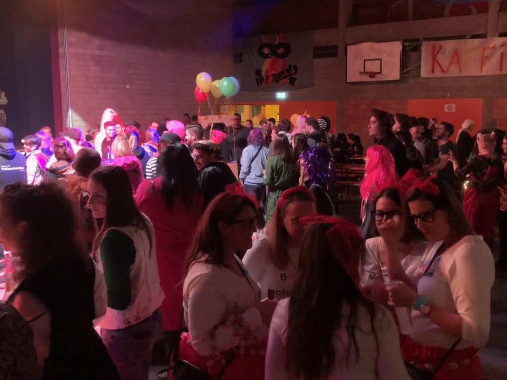 Das Publikum strömte besonders ab 23 Uhr zahlreich an den Maskenball. Die Halle war immer gut gefüllt, aber sicher nicht übermässig voll. Als Sujet fiel z.B. der später prämierte Fasnächtler mit einer Matratze auf dem Rücken auf. Aber auch eine Dame im Heissluftballon war sehenswert und erhielt ebenfalls einen Preis. Weiter gab es Kinderschokobonbons-Damen, Bob-, Schlitten- und Skifahrer, Militärpilotinnen und eine Gruppe mit vielen älteren Damen mit grauen Haaren und Stöcken, die sich ebenfalls auszeichnen lassen durften. Ein kunterbuntes Treiben.