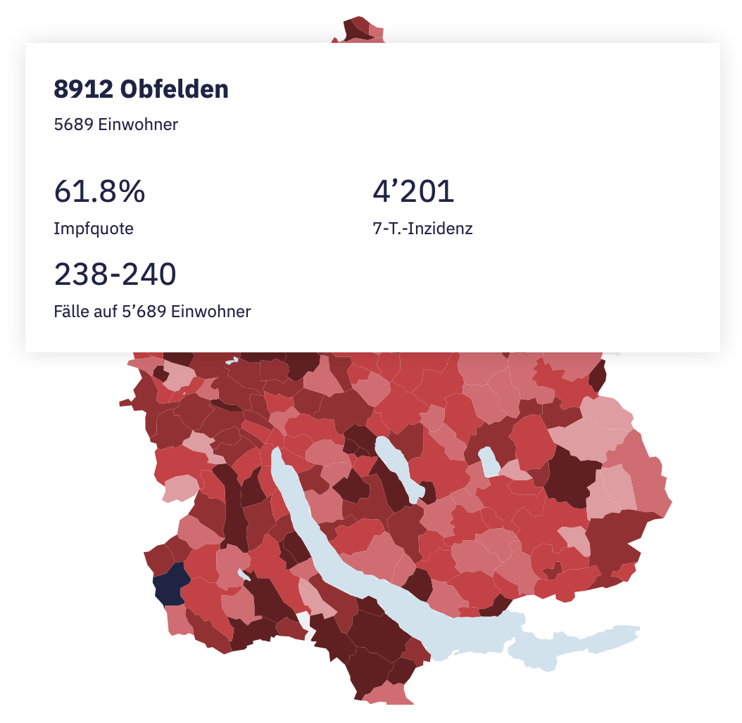 Gemäss dem Tages-Anzeiger hat Obfelden aktuell eine 7-Tage-Inzidenz von über 4’200. Das ist der dritthöchste Wert aller Zürcher Gemeinden. Die Impfquote in Obfelden verharrt auf 61.8 Prozent.