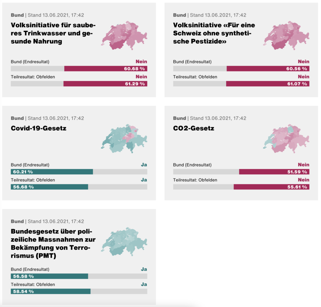 Insgesamt fünf nationale und drei kantonale Vorlagen standen am Sonntag, 13. Juni 2021 zur Entscheidung. Die Stimmbeteiligung in Obfelden lag mit 63% hoch.