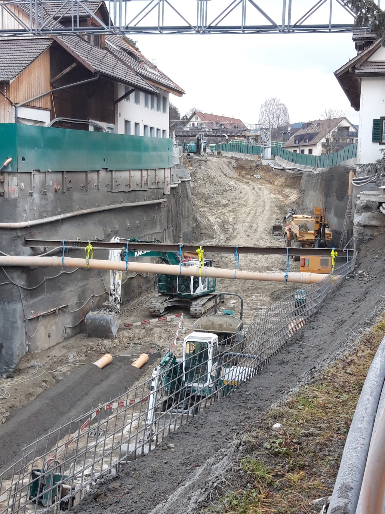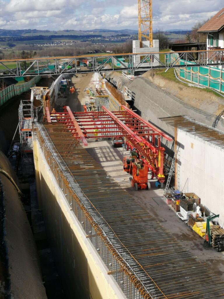 Die für den Tunnel-Tagbau benötigte Baugrube wird in anderthalb Meter Schritten in 4 bis 5 Etappen ausgehoben. Seitlich werden Spritzbetonwände für die nötige Stabilität sorgen. Der ganze Tunnel wird von Ottenbach in Richtung Hirschen gebaut. Die Zulieferung wickelt man von Ottenbach her ab und der Abtransport des Aushubs erfolgt auf der anderen Seite in Richtung Hirschen.