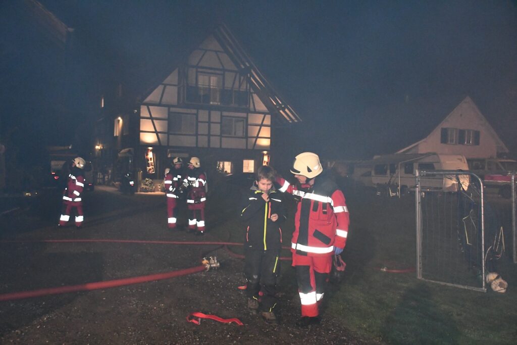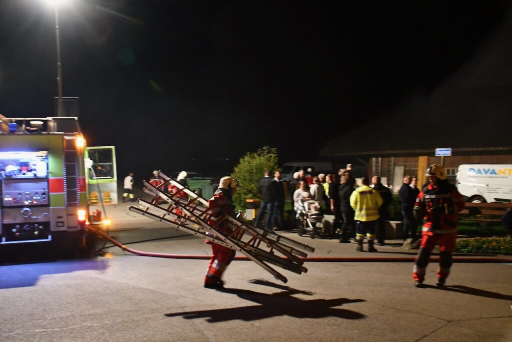 Die Szenerie mit Blaulicht und viel Rauch wirkte schon ziemlich echt, was auch einige Schaulustige anlockte. Nach gut einer Stunde war Schluss. Schliesslich folgte auch noch ein gemütlicher Teil mit Speis und Trank, als Dank für die gute Arbeit der Feuerwehr.