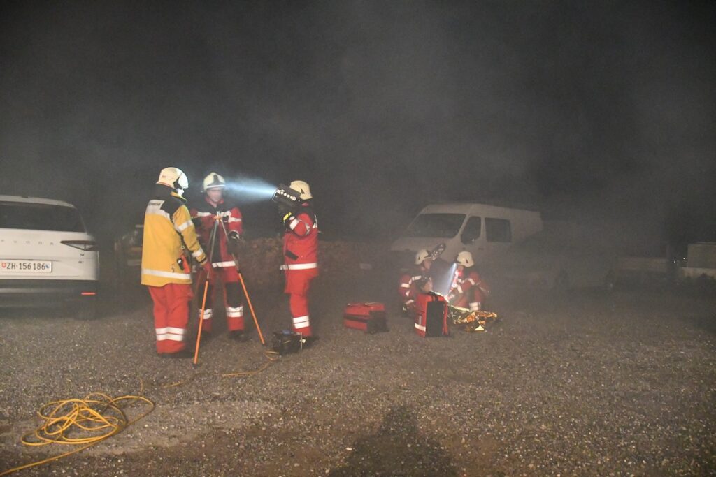 Bei der Firma Davanti war am Freitagabend ein Auto verunfallt und in Brand geraten. Das Feuer griff schnell auf eine Holz-Scheune über. So präsentierte sich die Situation an der Übung der Feuerwehr Obfelden. Dazu waren auch Gäste der umliegenden Feuerwehren und Gemeindevertreter eingeladen.