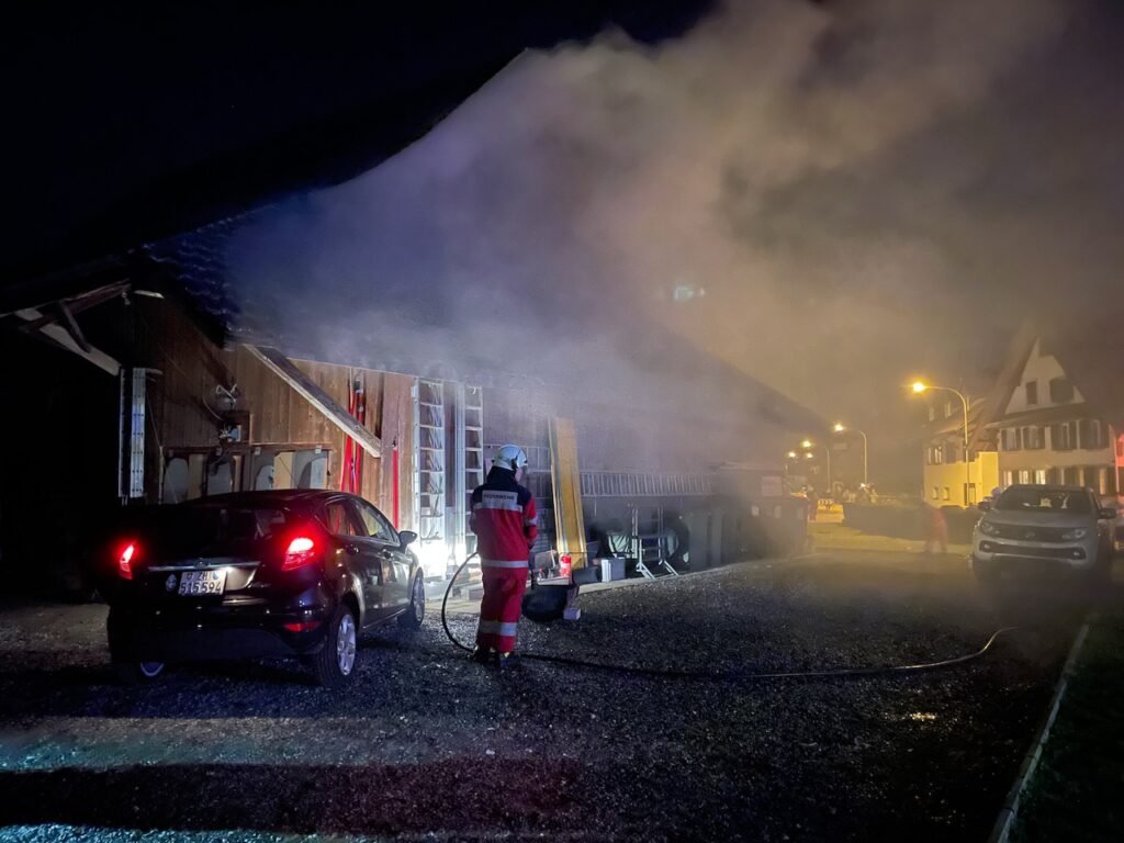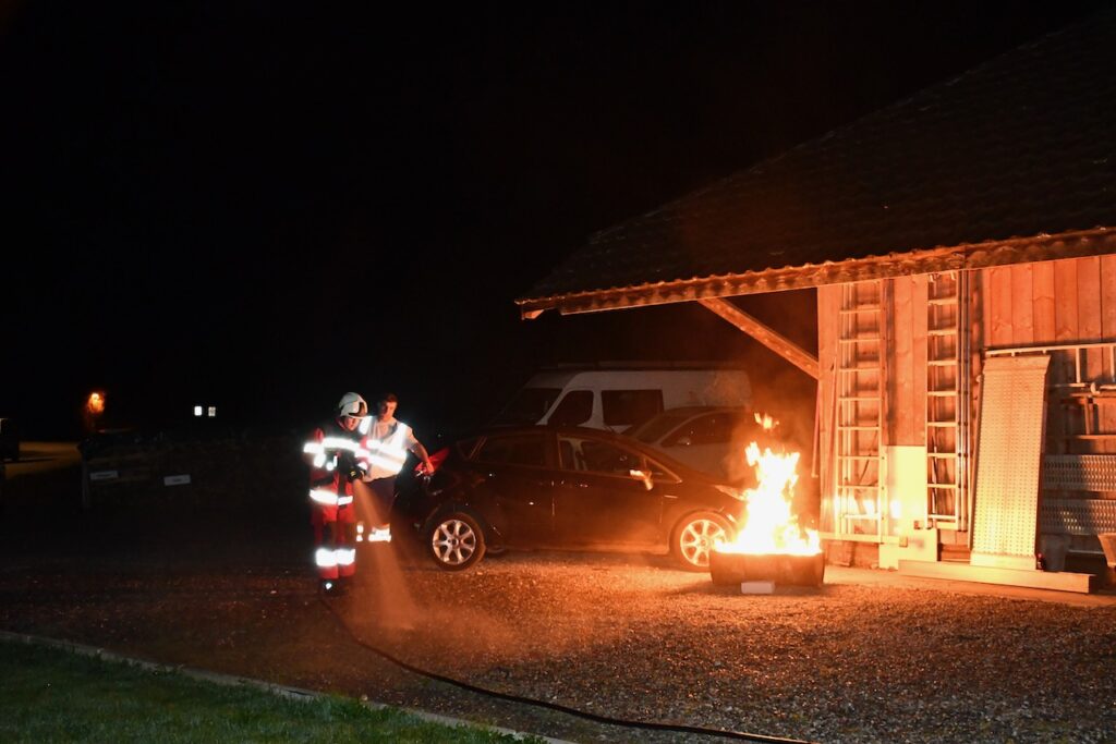 Als erstes traf das Tanklöschfahrzeug ein. Dieses wurde so auf dem Brandplatz eingewiesen, dass auch die Autodrehleiter noch Platz hätte. Diese wurde aber für die Übung nicht aufgeboten. Als erstes löschte man den Fahrzeugbrand und borg die Verletzten. Danach musste in der Scheune der Brand bekämpft und auch nach Personen gesucht werden.