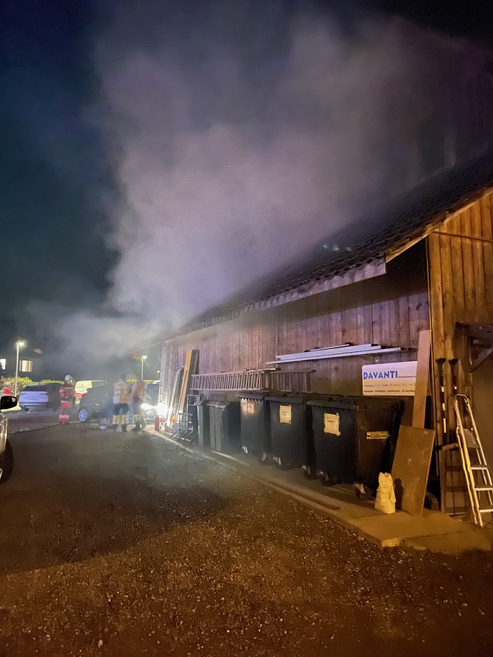 Bei der Firma Davanti war am Freitagabend ein Auto verunfallt und in Brand geraten. Das Feuer griff schnell auf eine Holz-Scheune über. So präsentierte sich die Situation an der Übung der Feuerwehr Obfelden. Dazu waren auch Gäste der umliegenden Feuerwehren und Gemeindevertreter eingeladen.