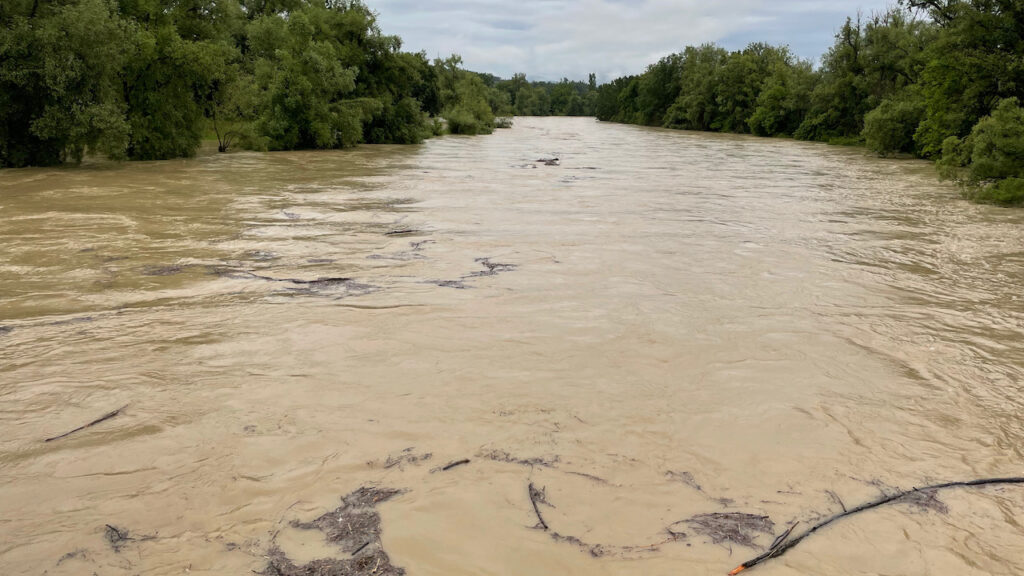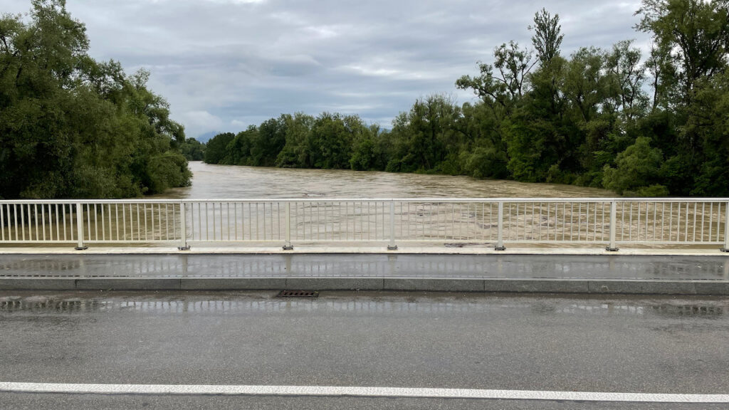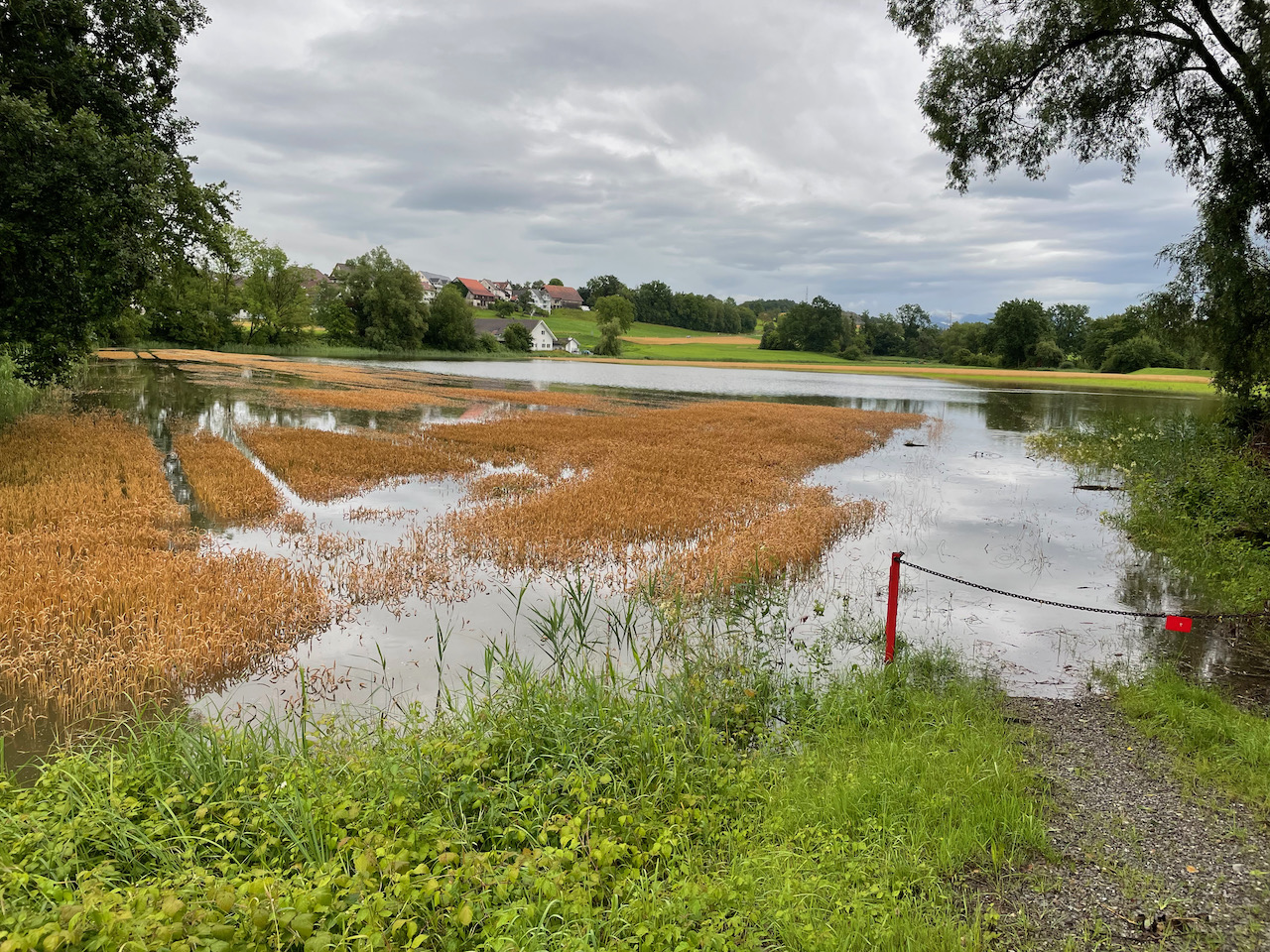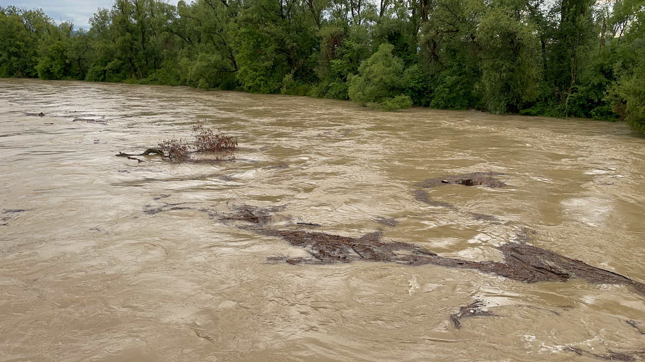 Der Pegel der Reuss steigt seit dem Morgen stark an. Kurz vor 20 Uhr erreichte die Hochwassermarke 392.75 Meter. Die Abflussmenge liegt bei 635 Kubikmeter, was die Gefahrenstufe 3 von 5 bedeutet. (Messwerte des Bundesamt für Umwelt, Station Mühlau). Beim Blick von der Reussbrücke zeigt sich ein grosser breiter, schlammiger Strom. Immer wieder sind Äste, Treibholz und teils halbe Bäume zu sehen. Das Umland zeigt sich als See.