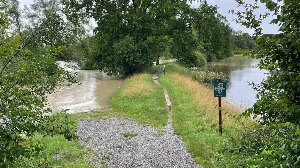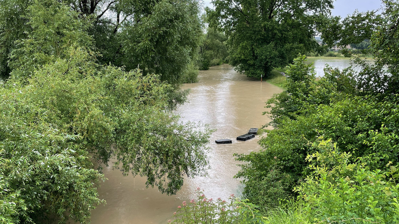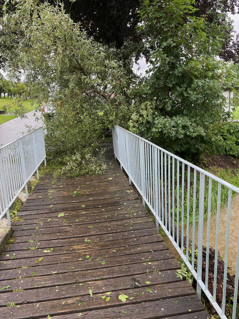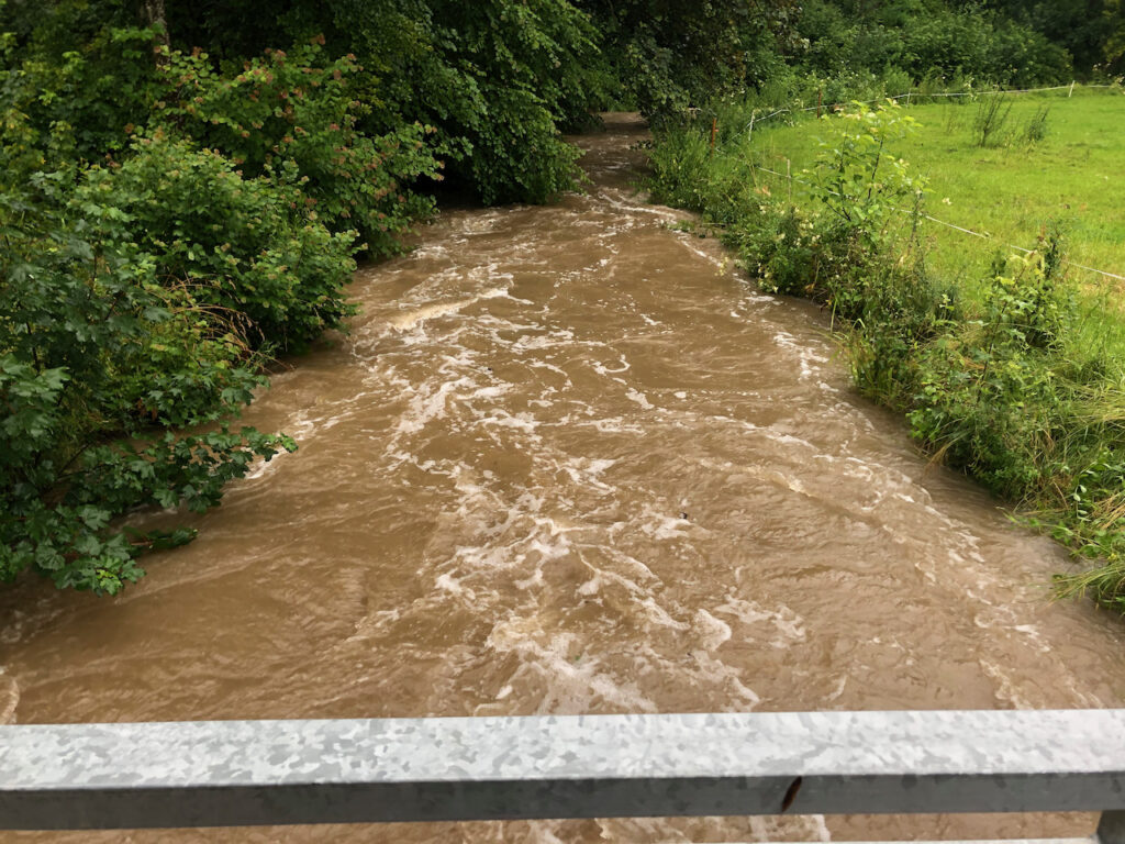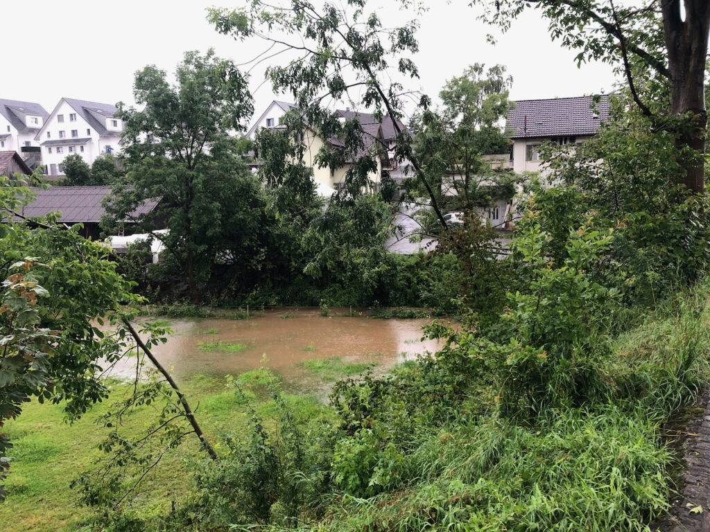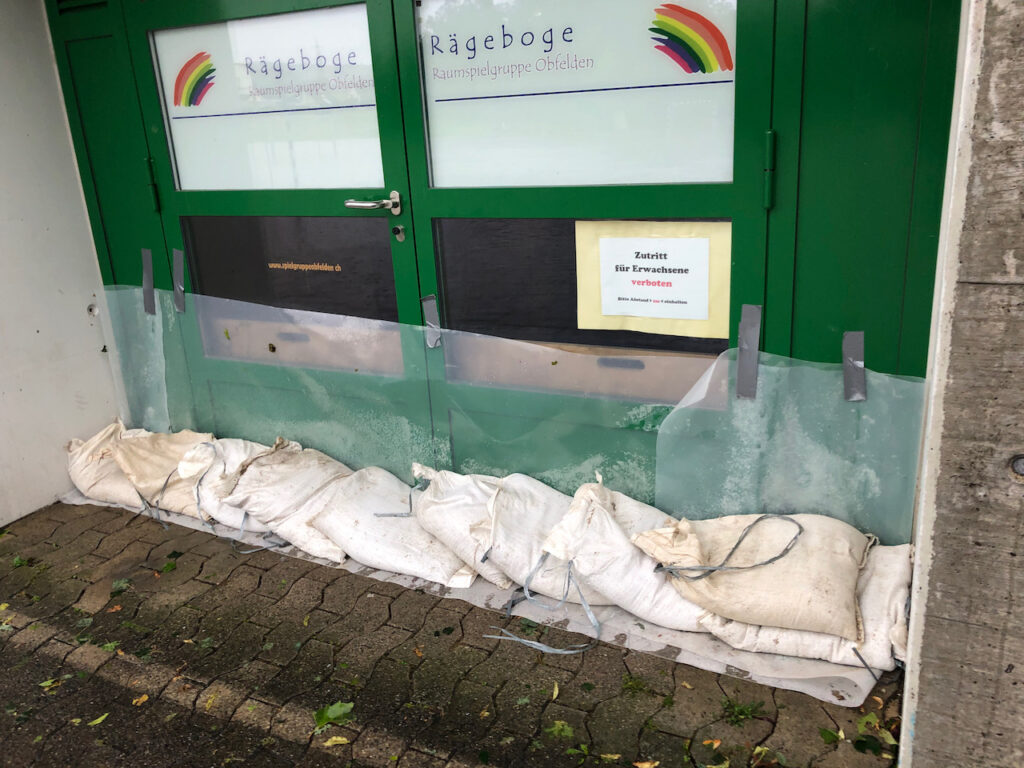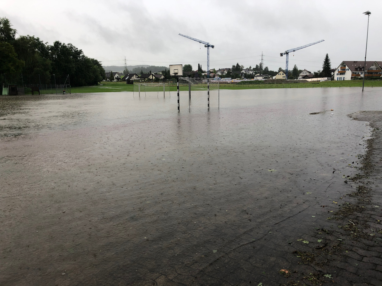 Am Nachmittag überflutete der Lindenbach den Sportplatz Zendenfrei. Das Wasser fliesst durch den Spielplatz bis zur Mehrzweckhalle. Dort verhindern Sandsäcke das Eindringen des Wassers in die Untergeschosse.